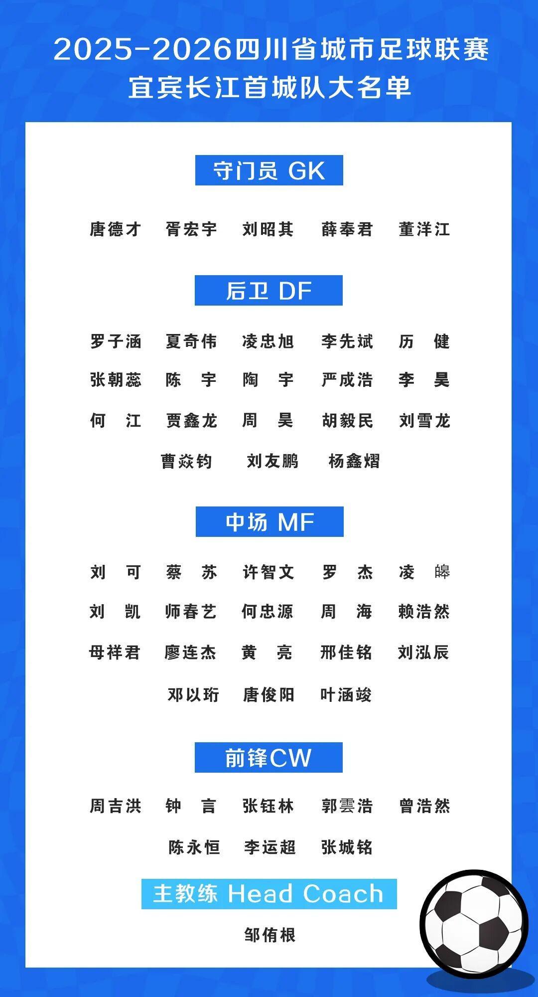 星空体育app下载-川超宜宾队公布大名单:邹侑根挂帅,定名宜宾长江首城队