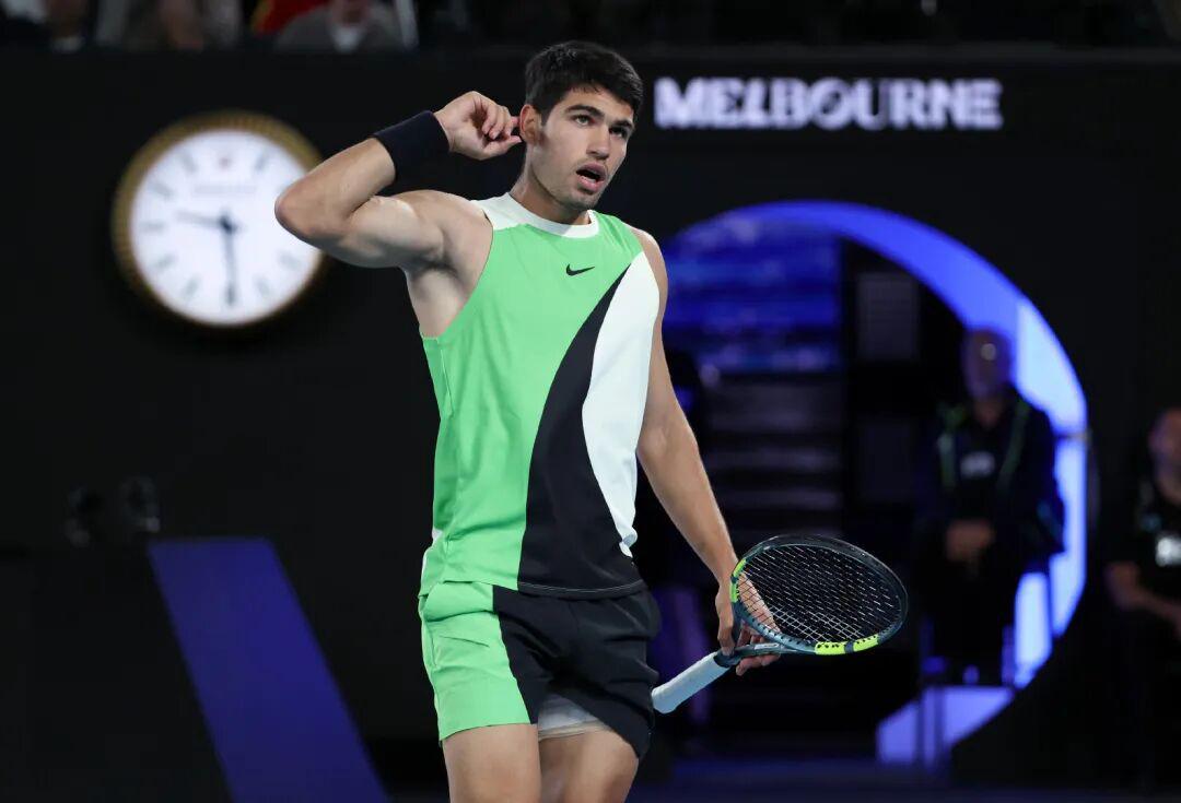 第三盘,在完成一次极限救球得分后的阿尔卡拉斯用右手指着耳朵,聆听观众的欢呼,这是意气风发的少年郎最喜欢的局间庆祝动作。
