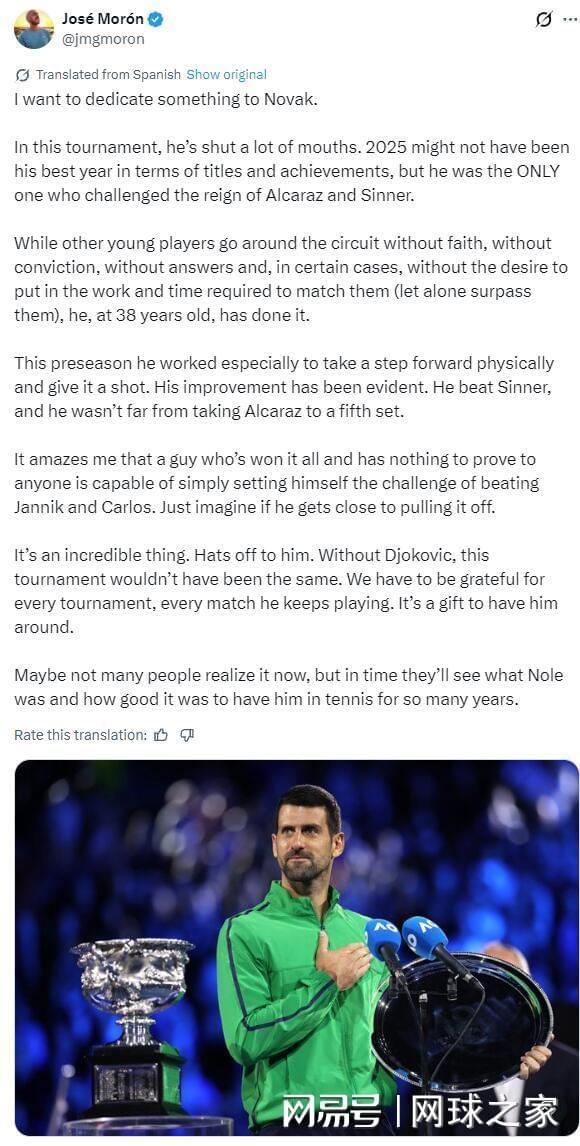 José Morón的文中最有远见的部分,或许是对德约科维奇历史地位的预判:“或许现在很多人还没意识到,但随着时间的推移,终将有人领悟他多年来在网坛精彩表现的非凡意义——拥有他征战网坛的岁月何其珍贵。”