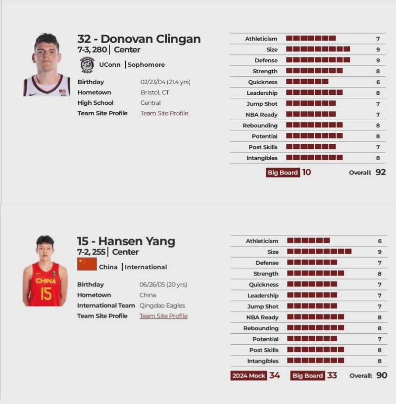 接着我们以NBA draft网站的选秀报告评分做个对比,克林根总评分92分,杨瀚森90分。